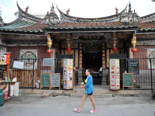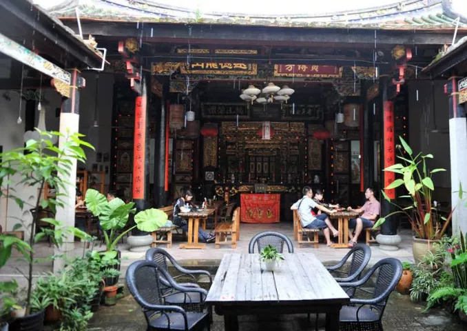 廈門曾厝垵曾氏宗祠是座具有閩南特色的祠堂,依舊高懸牌匾,供奉著木雕朱漆描金的祖宗牌位,但新添了吧臺紅酒、木桌藤椅之后,就搖身變成一家時尚咖啡館。據說過去每逢清明和冬至,曾氏族人都會聚集在宗祠祭祖,除此之外大門緊閉。而海邊的房屋一旦久無人住,就容易生白蟻、結蛛網,祠堂理事會于是就有了“把宗祠利用起來”的想法??Х瑞^負責人說他只做了“加法”,沒有破壞宗祠原有的任何東西,像在宗祠這樣的開放式空間無法安裝空調,設計者便在屋頂上安裝噴淋系統,啟動開關后,細密的水霧就籠罩整個老厝,降溫效果還不錯。