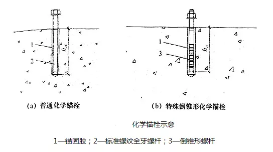 化學錨栓是指由金屬螺桿和錨固膠組成,通過錨固膠形成錨固作用的錨栓。化學錨栓按照其適用范圍可分為兩種:適用于開裂混凝土和不開裂混凝土的化學錨栓及適用于不開裂混凝土的化學錨栓。